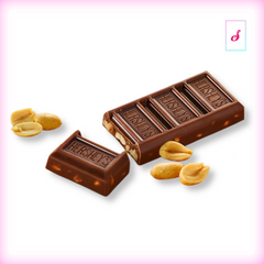 Zucker, ERDNÜSSE, Pflanzenöl (Kakaobutter, Palm-, Shea-, Sonnenblumen- und/oder Distelöl), Schokolade, MagerMILCH, Molkenpulver (MILCH), MILCHfett, Emulgator (SOJAlecithin), Salz, Vanillin. Enthält: ERDNÜSSE, MILCH, SOJA.